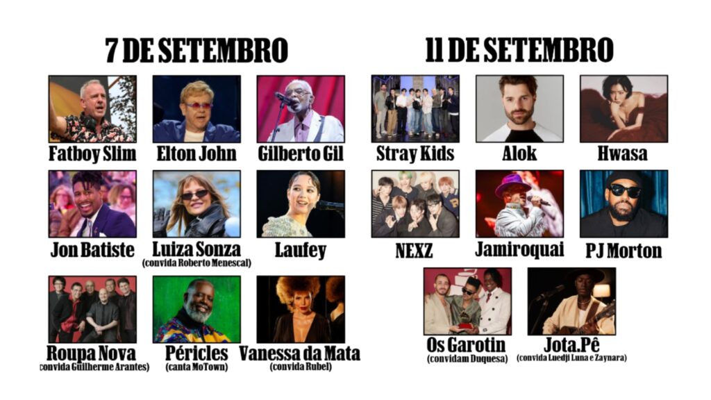 Fatboy Slim, Elton John, Gilberto Gil, Jon Batiste, Luísa Sonza com Roberto Menescal, Laufey, Roupa Nova com Guilherme Arantes, Péricles e Vanessa da Mata com Rubel